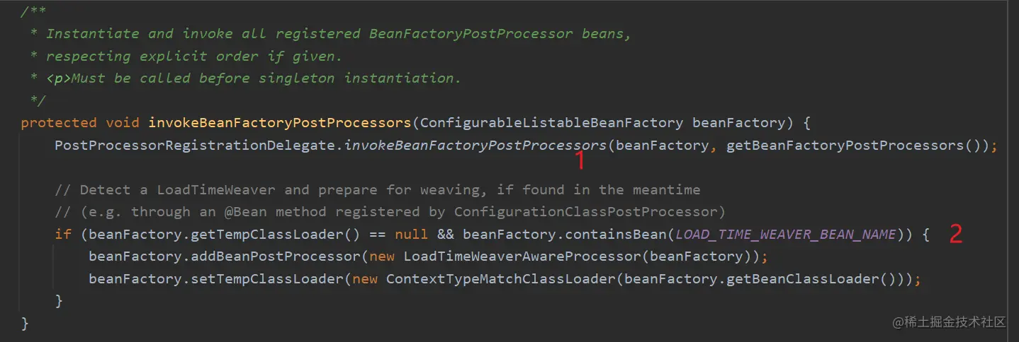 翻译过来就是:实例化并调用所有注册的 BeanFactoryPostProcessor bean,如果给出,则尊重明确的顺序。必须在单例实例化之前调用。( 最后这个没明白啥意思 )