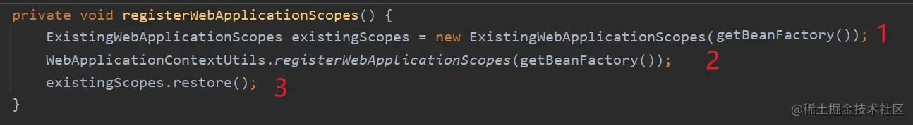 3.2 调用 WebApplicationContextUtils 的 registerWebApplicationScopes() 方法来注册 scope。
