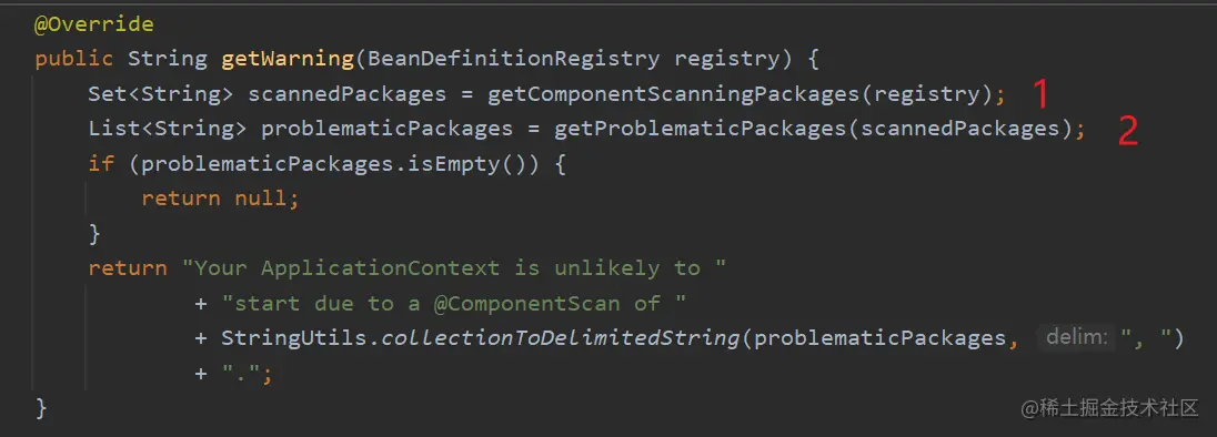 方法里面首先调用getComponentScanningPackages()方法获取了需要扫描的包 scanedPackages。然后调用 getProblematicPackages()方法,过滤出有问题的扫描包路径 problematicPackages,最后判断如果真的存在,给出日志。