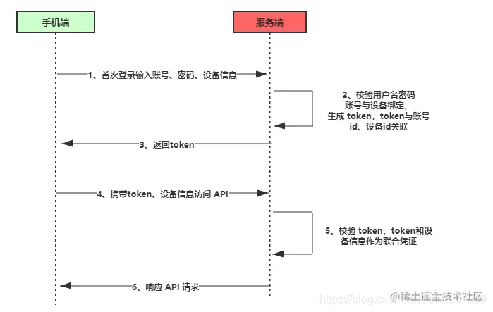 将 token 返回给移动端,移动端将 token 存入在本地,往后移动端都通过 token 访问服务端 API ,当然除了 token 之外,还需要携带设备信息,因为 token 可能会被劫持。带上设备信息之后,就算 token 被劫持也没有关系,因为设备信息是唯一的。