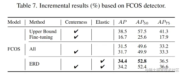 接下来将介绍 ERD 和 GFLV1 中的 ERS,作者将他们的方法推广到了表7中的 FCOS,这说明了方法的有效性。