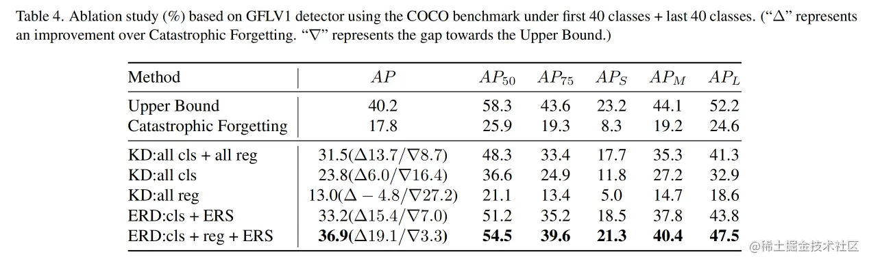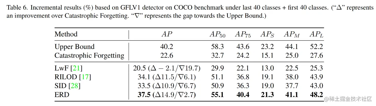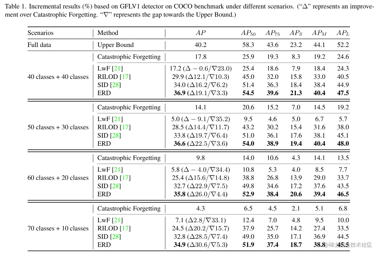在表1中展示了前 40 个类和 后 40 个类场景下的增量结果。