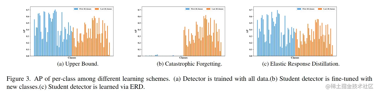 针对上述问题,对基于响应的知识蒸馏方法进行了反思,发现在适当的位置进行蒸馏是促进 IOD 检测效果的关键。在此启发下,作者提出了弹性响应蒸馏 (ERD),分别从分类头和回归头弹性学习响应。与以往的工作不同,在回归响应中引入了增量局部化蒸馏,使学生检测器在增量学习过程中具有学习位置模糊性的能力。此外,提出了弹性响应选择策略 (ERS),可以根据不同响应的统计特征自动选择蒸馏节点,从而评估所有位置的质量并提供有价值的响应。在本文中,解释了如何实现约束,最后如何确定哪些响应是重要的。这大大缓解了灾难性的遗忘问题,并显著缩小了与充分训练之间的差距。并在 MSCOCO 数据集上进行了大量的实验,支持了作者的分析和结论。