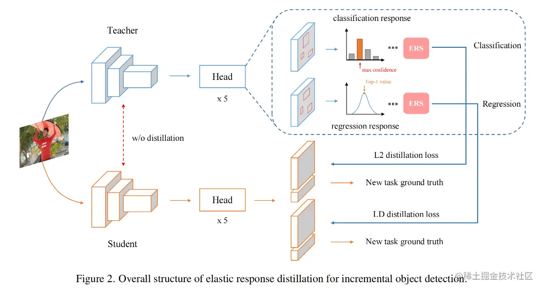 首先,使用 ERD 从教师检测器的分类头和回归头中学习弹性响应。其次,采用增量定位损失来提高学生检测器的定位信息提取能力。值得注意的是,为了从教师检测器中获得更有意义的响应,即从教师检测器提供的响应中计算蒸馏损失,提出了 ERS 策略。学生检测器的整理学习目标定义为 公式(1)。