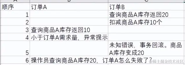 事务 A 读取了事务 B 未提交的数据,如果事务 B 回滚了,事务 A 读取的数据就是脏的。 举例:订单 A 需要商品 A20 件,订单 B 需要商品 A10 件。仓库中有商品 A 库存是 20 件。订单 B 先查询,发现库存够,进行扣减。在扣减的过程中,订单 A 进行查询,发现库存只有 10 个不够订单数量,抛出异常。这时候订单 B 提交失败了。库存数量又变成 20 了。这时候,仓库人员去查库存,发现数量是 20,可是订单 A 却说库存不足,这就让人很奇怪。
