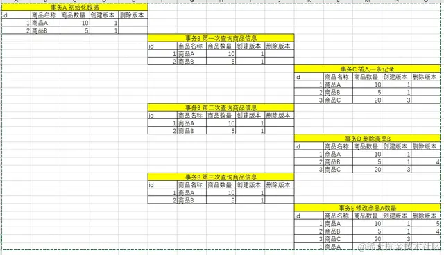 事务 A id =1 初始化了数据 事务 B id=2 进行了查询操作(MVCC 只读取创建时间小于当前事务 ID 的数据或者删除时间大于当前事务 ID 的行) 事务 B 的结果是 (商品 A:10, 商品 B:5)