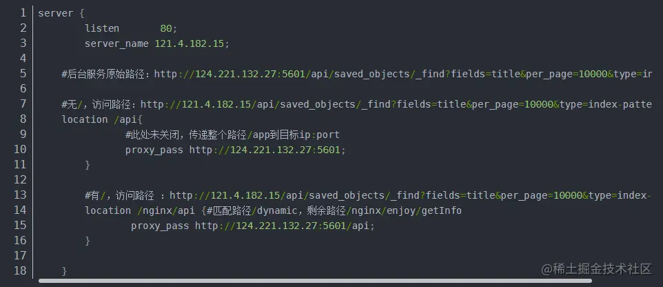 如果代理目标:ip+端口+项目名称,则至二级把/nginx/api 替换成/api,并将/saved_objects/_find?fields=title&per_page=10000&type=index-pattern给补在api地址的后面。\