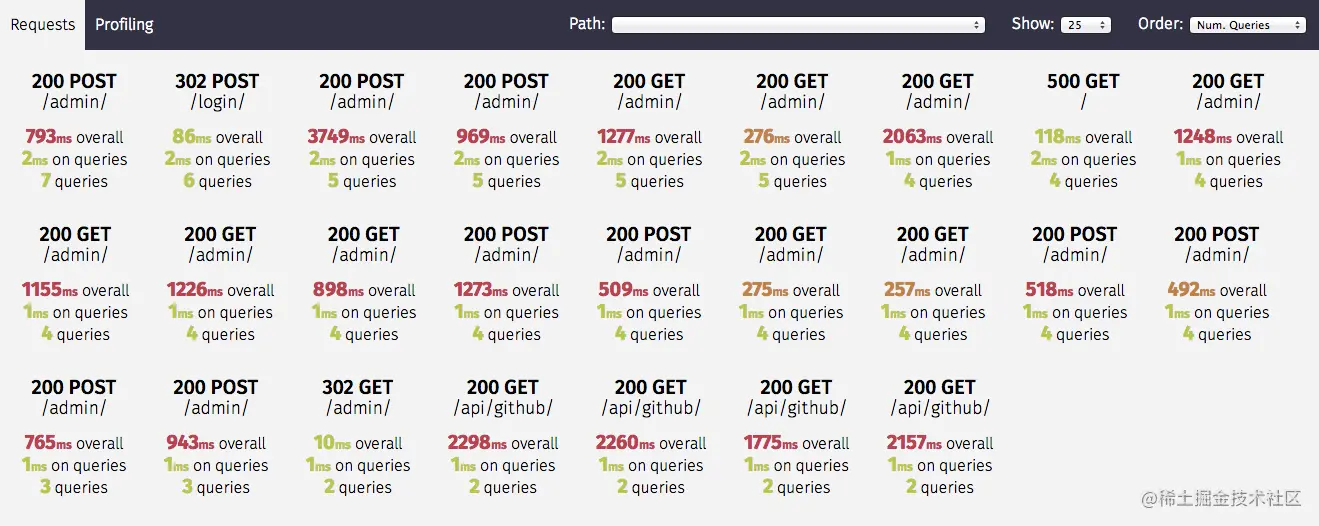 30、django-silk:Django 的性能分析工具。它可以将 Django 服务的平均耗时、请求次数、查询 SQL、代码性能分析等信息展示到一个页面,开发者有了这些信息就能够更快地找到 Django 服务的性能瓶颈和响应慢的原因。