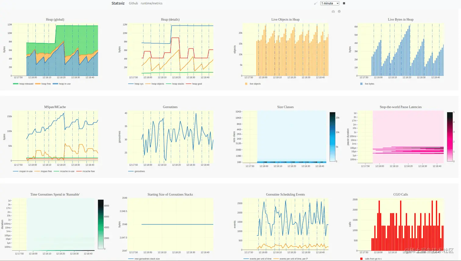 14、statsviz:实时展示 Go 程序运行时指标的 Web 应用。该项目通过图表可视化的方式,实时展示 Go 程序运行时的堆、对象、Goroutines、MSpan/MCache 等信息。