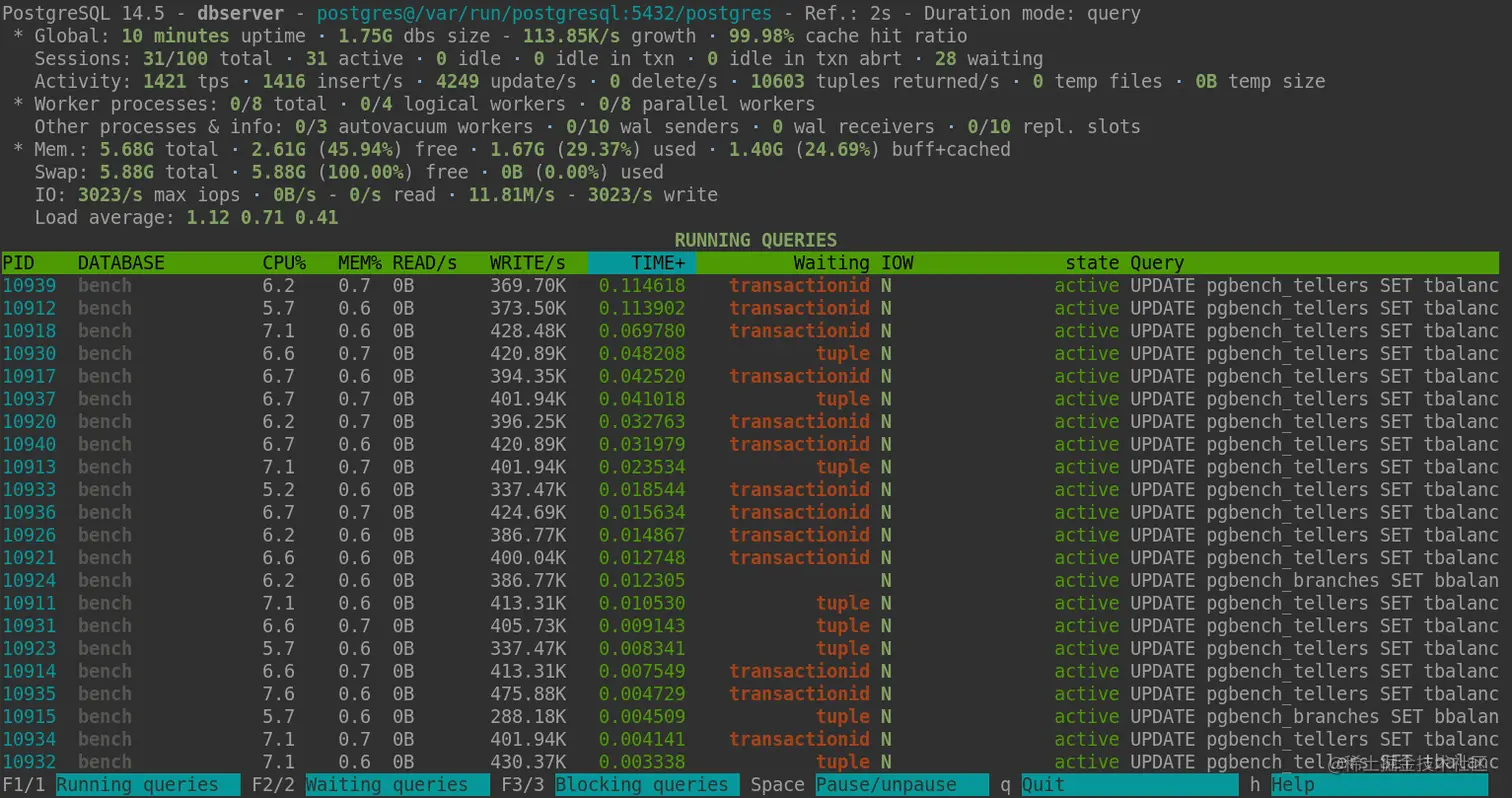 28、pg_activity:类似 top 的 PostgreSQL 数据库命令行监控工具。一条命令就能实时查看 PostgreSQL 数据库状态和每条 SQL 语句执行详情、耗时、占用资源、读/写速度等信息的工具。