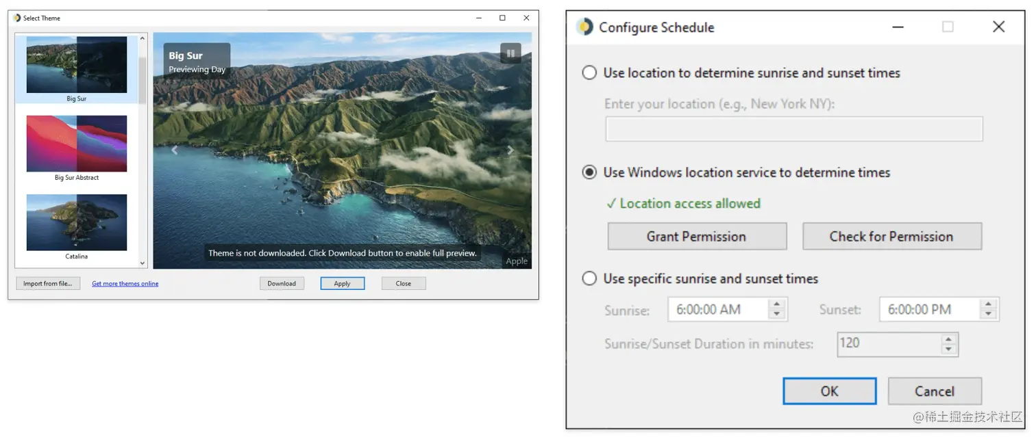 5、WinDynamicDesktop:类似 macOS 动态桌面的工具。该项目是将 macOS 动态桌面功能移植到 Windows 10,它可以基于你的位置计算出日出和日落的时间,并根据当前时间动态改变桌面壁纸,已上架 Microsoft 应用商店。