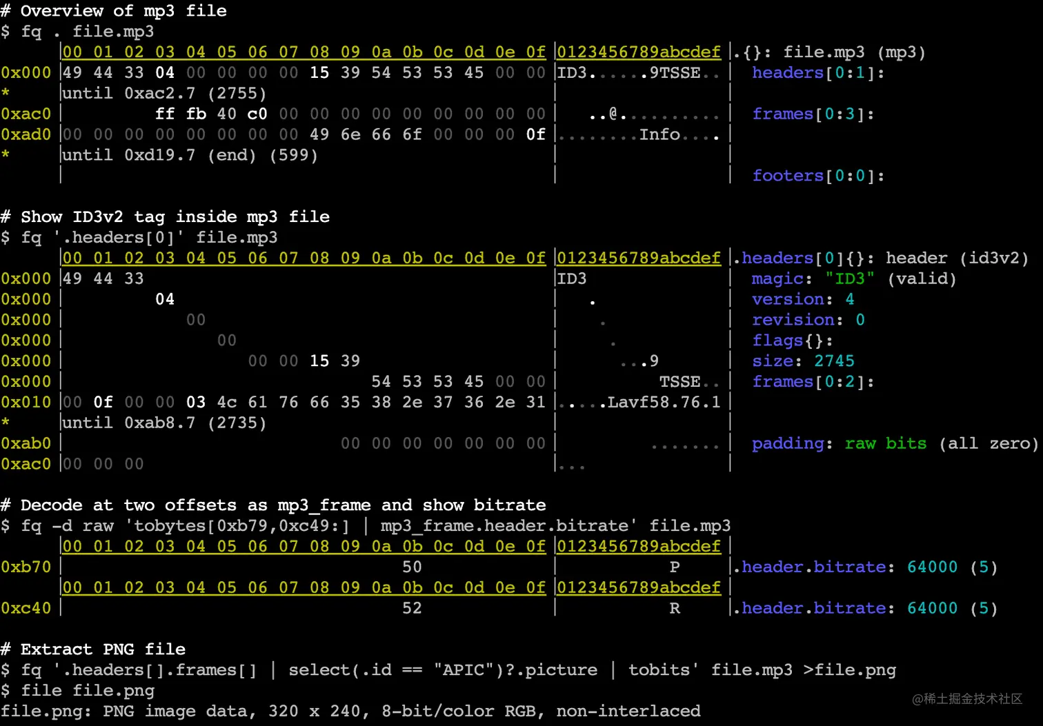 13、fq:一条命令查看二进制文件。用于查看和处理二进制文件的命令行工具,安装简单使用方便,支持 mp4、flac、mp3、jpeg 等多种格式的文件。