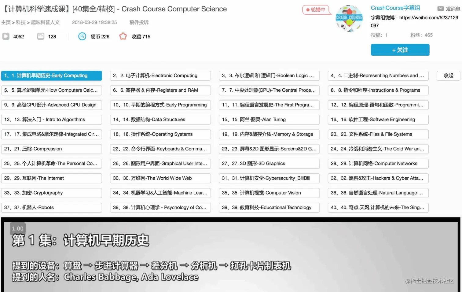 39、Crash-Course-Computer-Science-Chinese:计算机科学速成课[40集全/精校] 。油管上的计算机科学速成课(Crash Course Computer Science)中文字幕翻译版,视频从晶体管讲到了操作系统和人工智能,但并不会教你如何编程属于科普类视频。