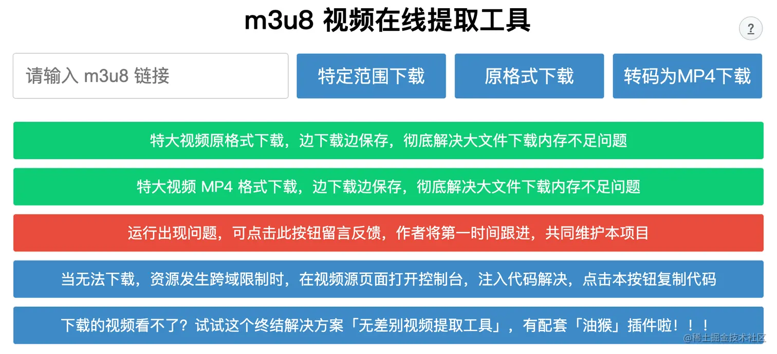 24、m3u8-downloader:m3u8 视频在线提取工具。m3u8 视频格式常用于直播服务,其原理是将完整的视频拆分成多个 .ts 视频碎片,其中 .m3u8 文件会详细记录每个视频片段的地址。视频播放时,会先读取 .m3u8 文件,再逐个下载播放 .ts 视频片段。该项目就是基于上述原理实现的 m3u8 视频提取工具,使用方便无需安装打开网页即可下载完整的视频。