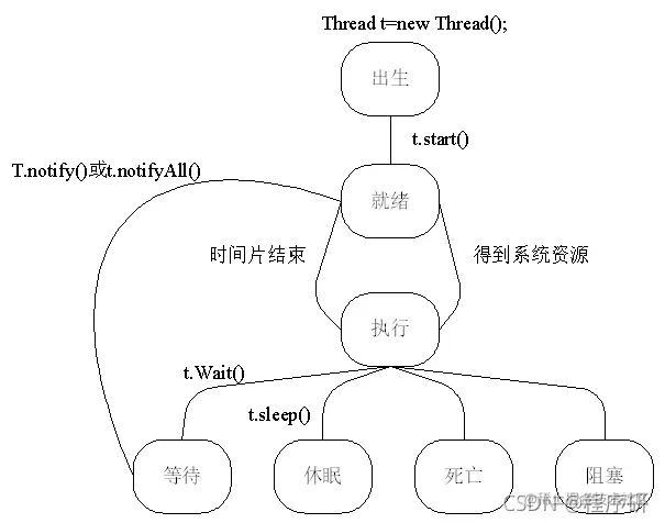 线程具有生命周期,其中包含7种状态,分别为出生状态、就绪状态、运行状态、等待状态、休眠状态、阻塞状态和死亡状态。