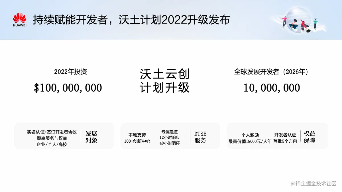 **沃土云创权益,**沃土计划2022升级将持续赋能开发者,计划提供的各项技术、商业、生态等多项激励政策支持;