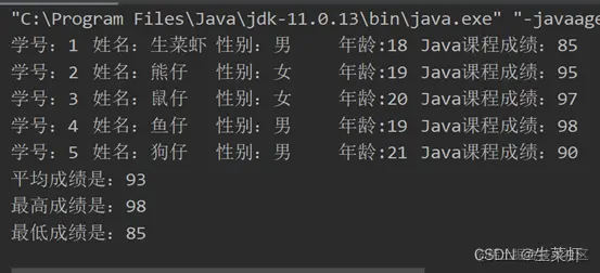 根据类Student的定义,创建五个该类的对象,输出每个学生的信息,计算并输出这五个学生Java语言成绩的平均值,以及计算并输出他们Java语言成绩的最大值和最小值。