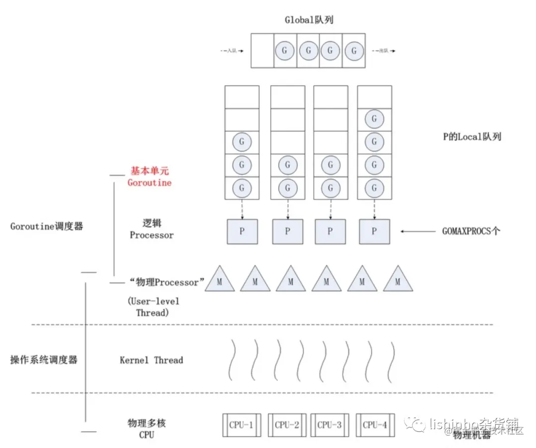 M必须拥有P才可以执行G中的代码,P含有一个包含多个G的队列,P可以调度G交由M执行。
