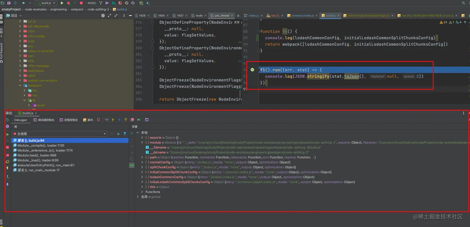 右键build.js,选择调试build.js,打开webpack 调试界面,代码此时已经运行到我们的我们设置的第一个断点处