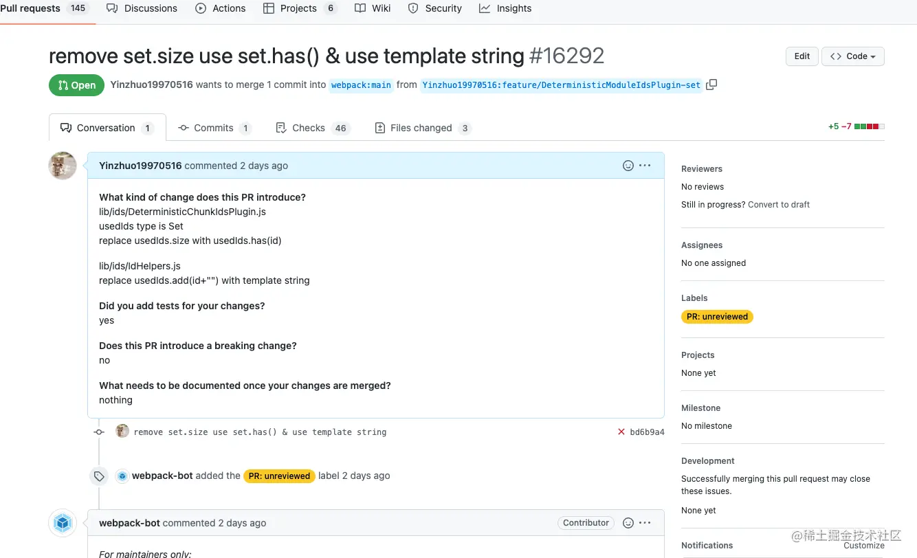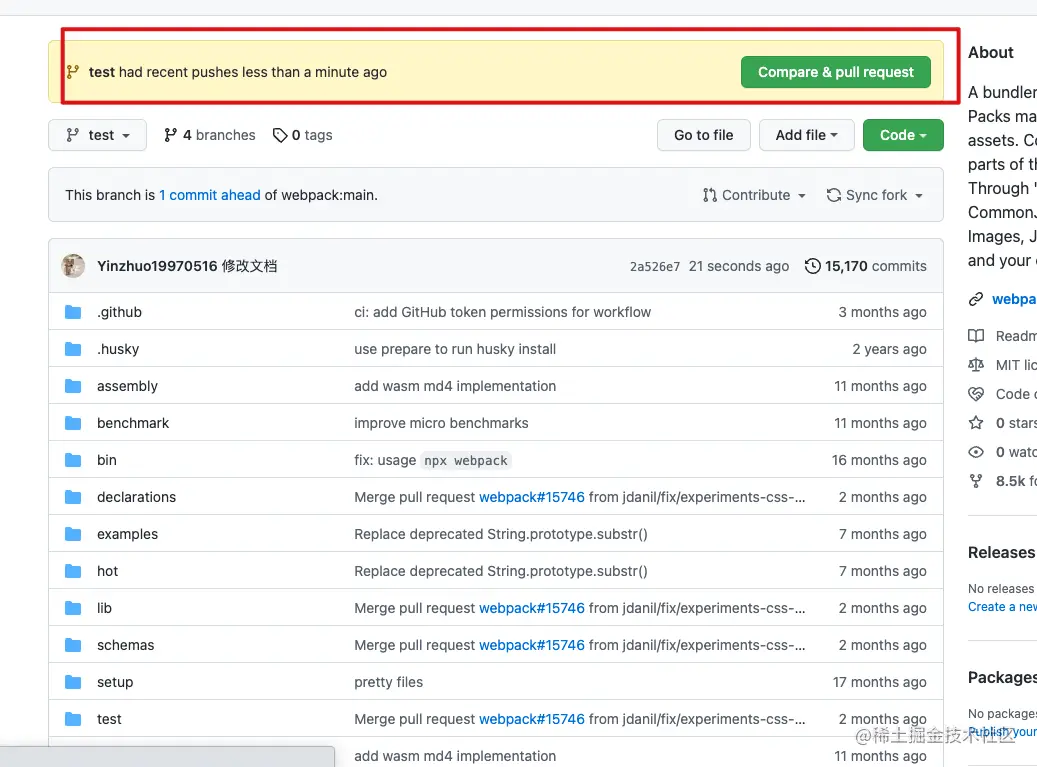 - 创建pr之后,就成功了,我们就可以在webpack源码仓库看到提交的pr了。
