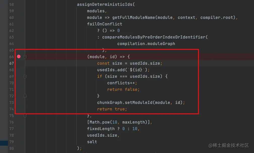 点击 >>| 按钮,直接运行到下一个断点处,可以看到圈出来的代码,usedIds 是一个set,用来存放moduleId
