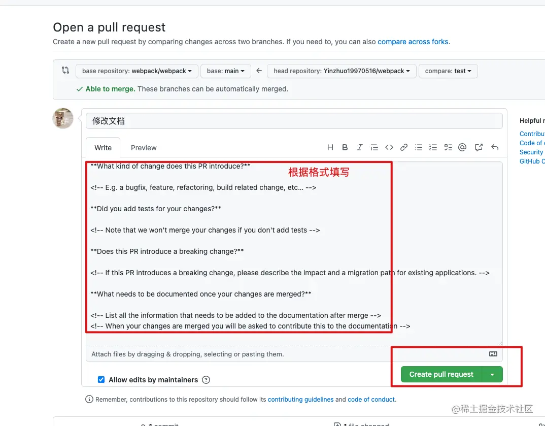 - 点击,进入webpack仓库代码提交合并页面,仿照以前的提交的git log 格式,填写信息,之后,点击 create pull request
