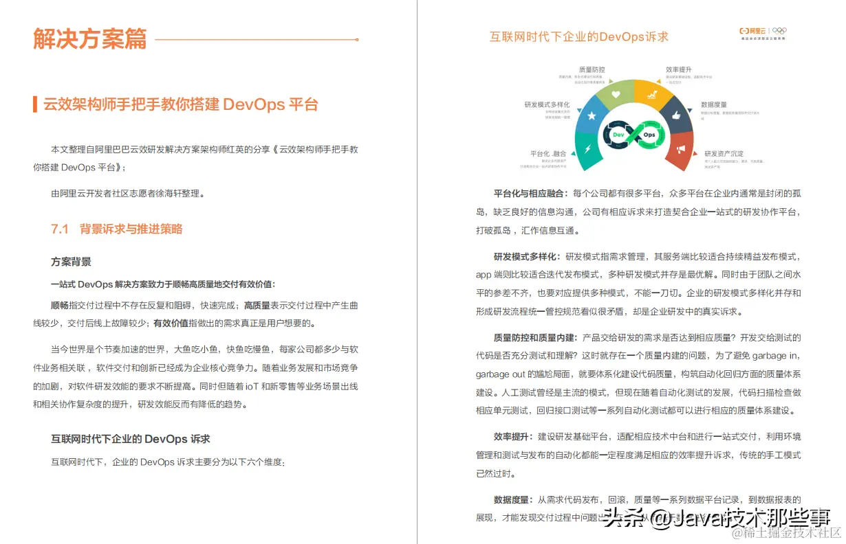 在这里分享我前段时间拜访阿里时的一位架构师朋友给的DevOps参考文档,该文档将DevOps分为四个部分进行讲解——敏捷研发+代码管理+持续交付+解决方案,让我们来看看阿里内部作为参考的文档内容