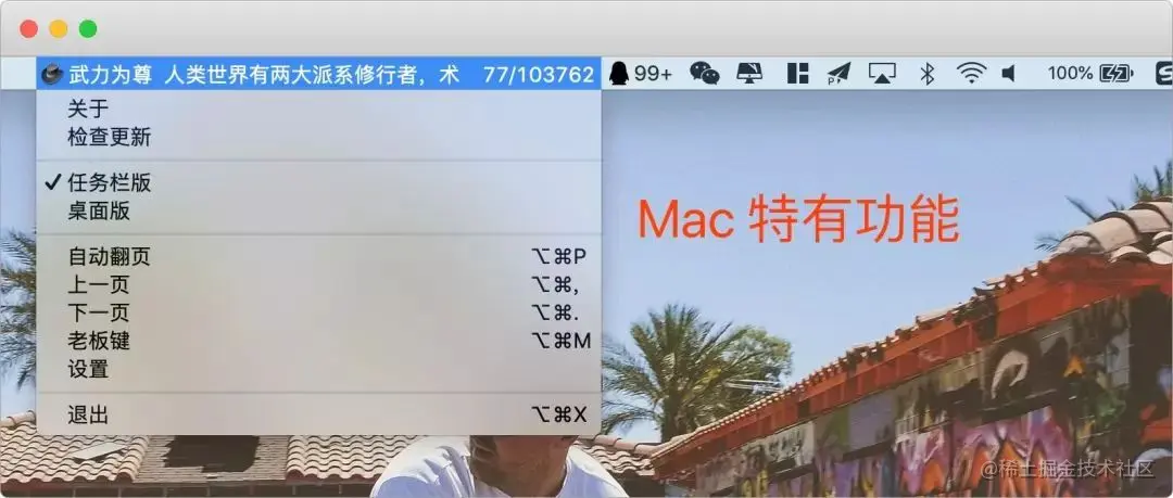在Mac系统上,Thief-Book增加了任务栏版,它可以将小说放置到顶部的任务栏中,相比Windows版更加隐蔽和安全。