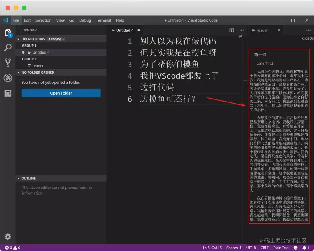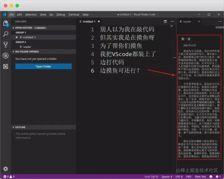 而VS Code插件版的Thief-Book,则更加丧心病狂了,它可以将小说偷偷地放在编辑器的底部。