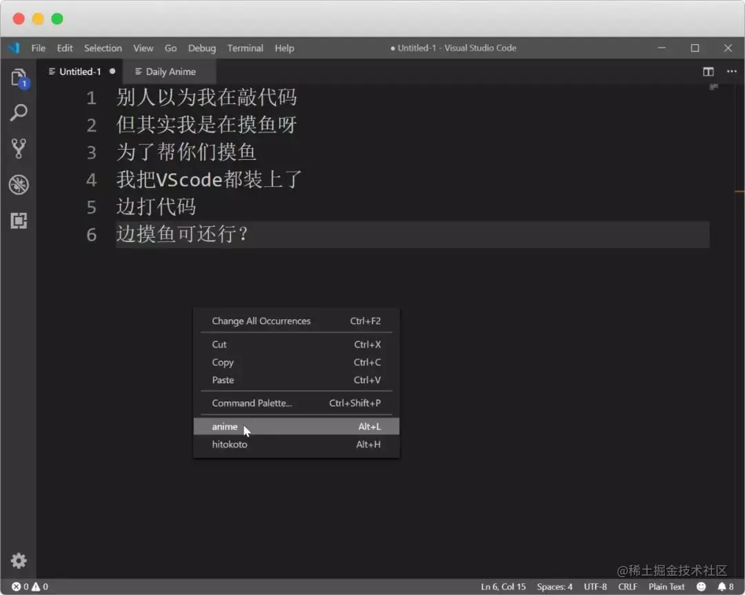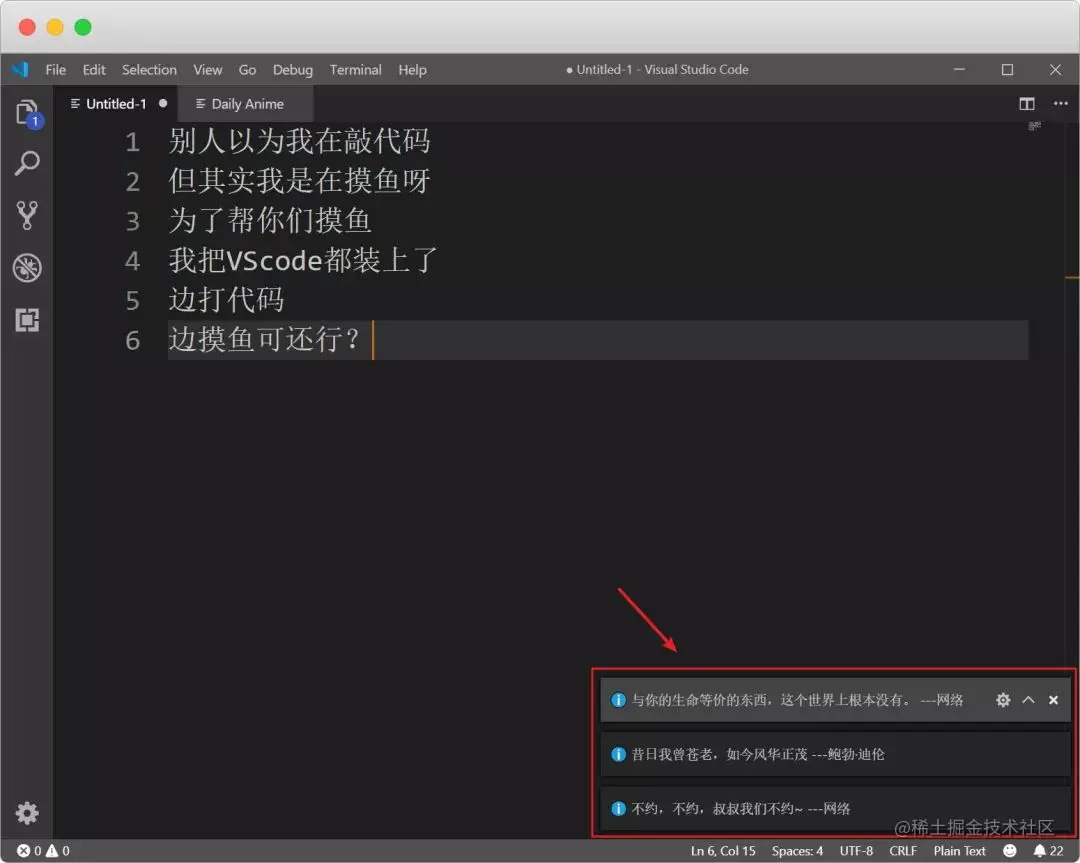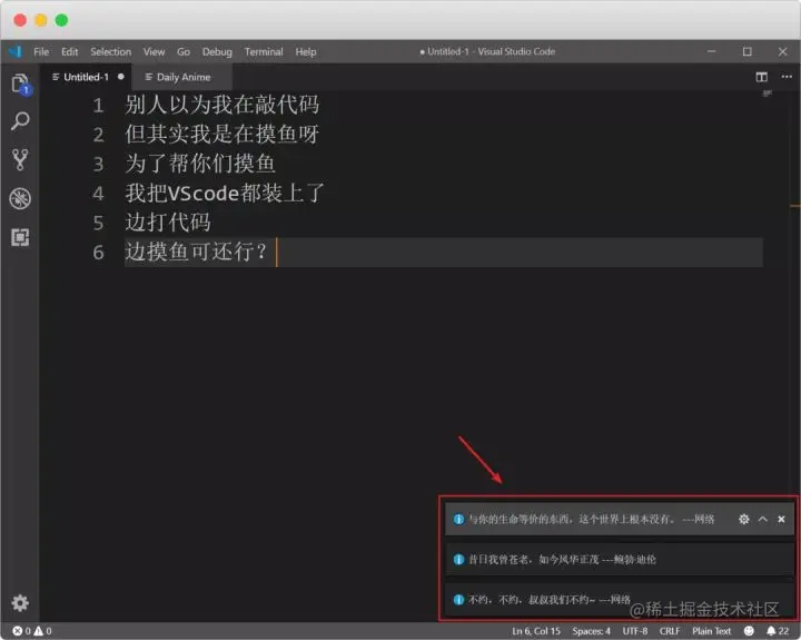 除了查看番剧信息,daily-anime插件还有另外一个功能hitokoto,它可以随机从网络获取一条句子,并在VS Code右下方弹出,其快捷键为Alt+H。