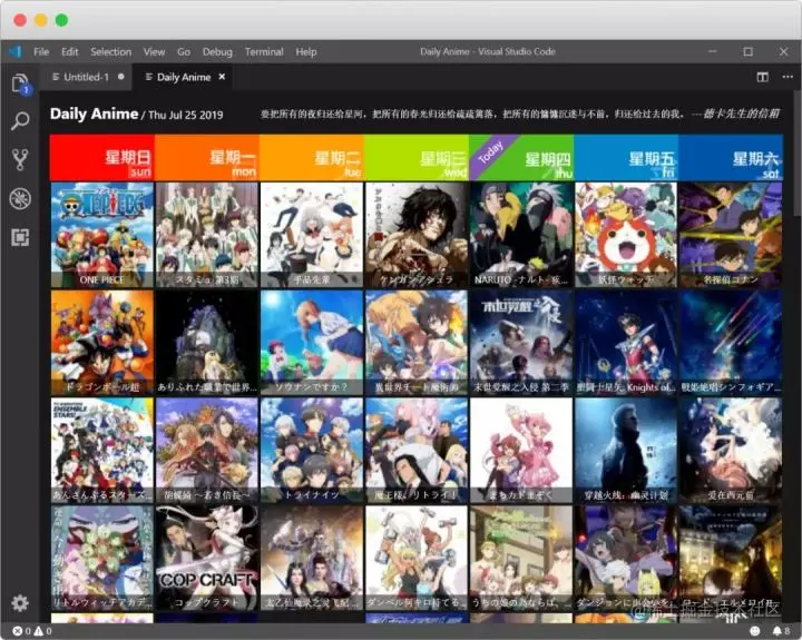 daily-anime插件,可以实现在VS Code内查看番剧的更新信息,但目前还不支持在VS Code内观看番剧,因为点击任意番剧的封面,都会跳转到浏览器中。