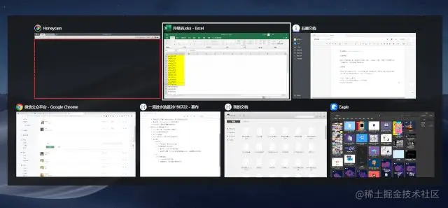 Alt+Tab:在多个窗口间进行切换。在按住Alt键的状态下,间隔敲击Tab键,就可以实现下图的效果。