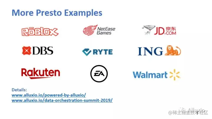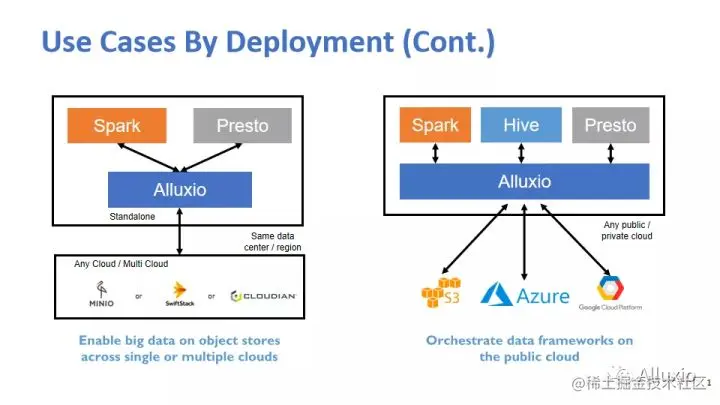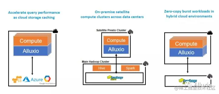 刚才也提到了, Presto是计算和存储分离,大家都知道互联网,虽然上网感觉好像到哪都很快,但其实是有距离的。比如说今天我们这个直播,大家可能看到,我们两个人的视频就没有那么流畅,为什么?因为我们距离有点远,从美国的硅谷到中国传输距离很长,有很多的网关路由器,延时就在增长,而Presto没有自己的数据,要查询任何东西,都要把要查的数据集给读出来,都要给load进来,一行一行地扫描一遍,那速度就很依赖于网络传输的速度,其实这也是Presto的瓶颈之一。我们可以把Alluxio和Presto或者其他的计算引擎部署到一起,它起到一个中间层的作用,就是说计算引擎只从Alluxio拿数据,然后Alluxio负责从实际的存储来拿数据。比如说我们最左边的这个例子,这个是现在很多新兴的互联网公司或者新的创业公司最常用的一个架构,它从创业第一天或者公司建立第一天起,数据就是完全的上云,自己不用建数据中心了,这是现在非常常见的一个模式。那数据都在云上,计算怎么办?从云上拿数据其实一方面是费用高,另外一方面是速度可能会慢,那怎么办?我们就通过Alluxio做一层缓存机制,如果数据在Alluxio集群里边,那我们从Alluxio可以拿到,如果说没在,我们的计算引擎也不用关心,让Alluxio去云上把数据拿回来,起到一个提速的作用。