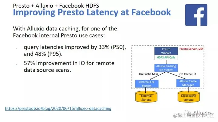 这个项目是我们跟Facebook脸书的合作,这也是BIN跟我一直在跟的一个项目。其实这个数据有点保守,从他们最近一次跟我们的讲座来看,他们是获得了10倍以上的提升。那这个技术跟前面略有不同,前面是一个分布式的缓存的设计,那这里我们管它叫Presto worker的local cache,略有不同,可以理解为一二级的缓存。那这个也是一样的逻辑,我们如果命中了,我们就本地拿给它,如果没命中就到远程去拿。这个项目在脸书已经得到非常广泛的使用,数以万计的服务器都在使用,具体的数字我可能不方便透露,这些服务器都是使用我们的local cache来做提速,而且我们还会有不少的后续工作,其实我们还有很大的潜力。