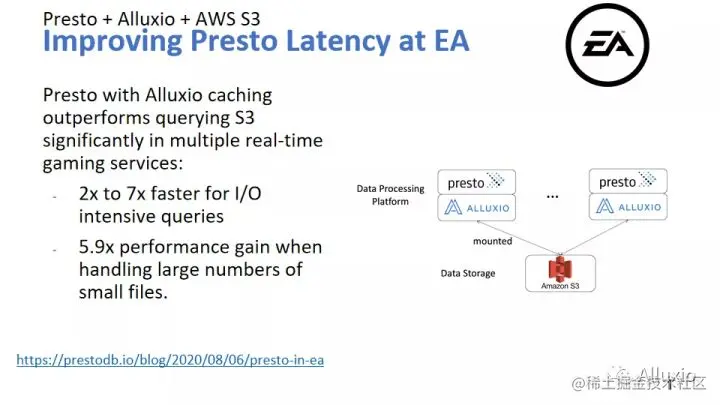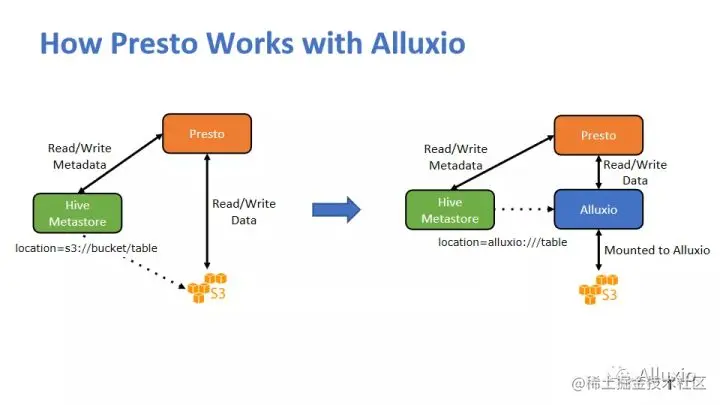 我们也是在最近的这一两个版本中,加入了一个叫Transparent URI和自动挂载的功能,现在我们不麻烦这个元数据和Hive Metastore给我们一个更新了的地址,原来你是S3还是HDFS,你还是给我这个,所以说对于Hive Metastore来说,它完全可以对Alluxio无感知。那等于说Presto还是拿到了S3的地址,我们不用修改代码,我们修改一下Presto的配置,把FS的默认实现换成Alluxio自己实现。就是当他看到这个是S3的,他会去Alluxio找,它会有一个自动挂载的机制,事先也会有一些配置,但是就一两行的配置加上之后,他自己到对应的S3 bucket上,把这个数据给挂载好。但对于我们的Hive Metastore也好,对于我们的这个Presto用户也好,都是无感知,因为它看起来这个表好像还在S3上或者在HDFS上,但实际上是到Alluxio这边走了一遭,如果说我们这个缓存有命中,Alluxio有这个数据了,它就会有非常好的提速效果。