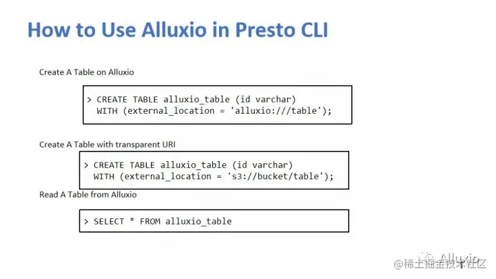 因为我前面讲了,Presto是存储和计算分离的,它并不太管理存储空间,你在Presto建表的时候,建这种external table时,那其实在干嘛?它就是指定一个路径,告诉Presto或者告诉Hive Metastore,我们这里建个表,这个表就是在某一个位置。那如果说你有了Alluxio的话,其实你在建表的时候就告诉Presto,这个表是在这个地方,我们是一个Alluxio打头的就好了。后面的这些工作全是其实都是由Presto和Alluxio来做的,用户的修改就已经是非常少了。那有了Transparent URI后,其实修改可以更少,我们都不用改原来的建表脚本,如果你原来有表,你是建在这个S3上,就不用动了,但如果你没建,你可以用这个命令,跟以前那个普通的S3也好还是HDFS也好都是一模一样的。然后你就在里边查询就好,你写任何一个SQL查询,你都不用管它的路径在哪,表一旦建好,对于普通的数据工程师或者数据设计师也好,他们知道这个table内容其实就够用了,就可以从table拿到数据。