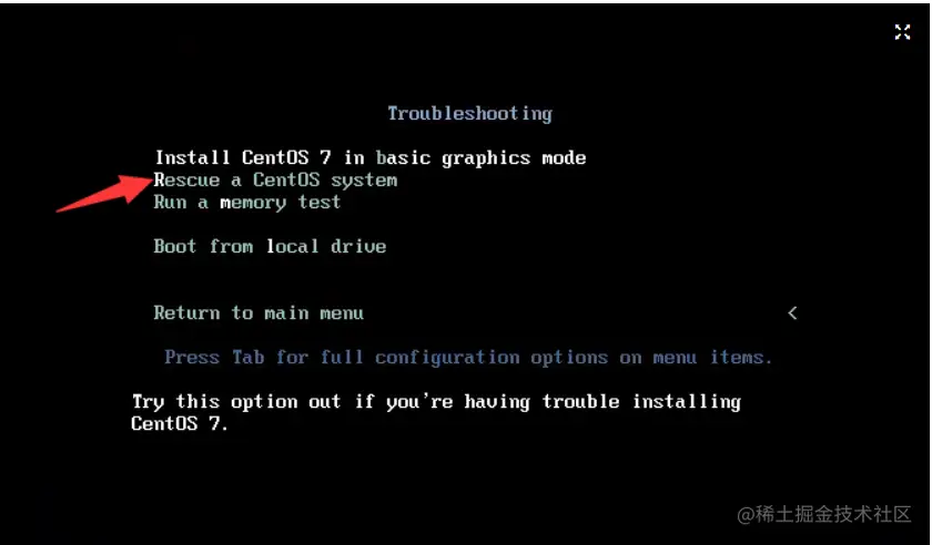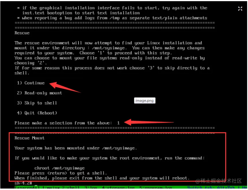 Troublesbooting --> Rescure a CentOS system --> 等待一段时间 --> 按"1 continue继续进行"