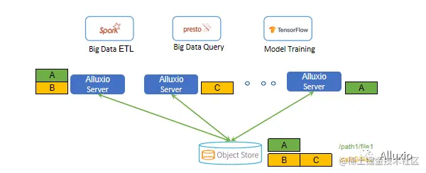 而Alluxio与很多的缓存解决方案的不同点就在于我们其实是一个分布式缓存,数据如果在一台机子上放不下,我们把它分到多台机子上,共同为大家提供缓存功能。