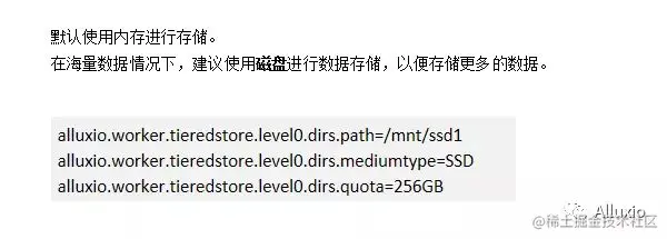 Worker的存储,这主要指的是Alluxio用什么样的存储介质以及存储大小来缓存底层存储系统的一些数据,默认是用内存来进行存储的,但是如果是在海量数据的情况下,建议配置磁盘,用磁盘来进行数据存储更多的数据。