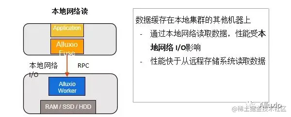 另一方面也可以通过在本地集群缓存来提升读速度,可能本地的机器并没有那么多的空间,可能需要把数据缓存在隔壁的机器上,在这种情况下,可以通过本地的集群缓存来提升速度,而这种读主要受本地的网络I/O以及RPC的影响,其实主要是本地网络I/O的影响,性能肯定是快于从远程存储系统中去读取数据的。