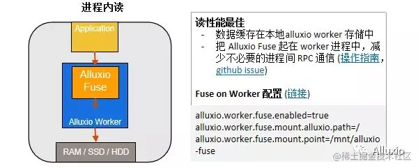 数据读最快的方式当然是进程内读,也就是说数据已经缓存在本地机器上了,而fuse是起在worker进程中,可以减少不必要的RPC通信,fuse直接在进程内跟worker说要这个数据,然后worker直接从本机去拿到数据,给到fuse以及再给到应用。如果要配置fuse on worker的话,可以去打开worker的配置, alluxio.worker.fuse.enabled =true就可以了。
