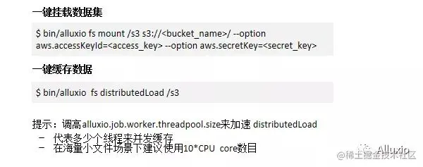 讲到数据缓存,Alluxio可以帮助提前缓存数据以提升训练性能,而且提前缓存也可以在训练中进行,可以用一键来挂载数据集到Alluxio文件系统中,通过一键分布式缓存命令来一键缓存所需要的训练数据,而这种提前缓存也可以通过调整job worker的线程池大小加速分布式缓存。