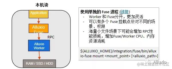 其次是可以使用单独的fuse进程,数据是存在本地机器上的,fuse是单独的进程, worker也是单独的进程,在这种情况下,worker跟fuse是分开的可以更加灵活。可以用多个fuse的挂载节点,针对不同的场景,读写的不同场景,进行个性化配置以及配置不同的应用权限。在这种情况下,因为fuse要跟worker进行多一层的RPC操作,这可能会带来一定的性能损耗或者资源损耗,会增加fuse和worker的CPU和内存的资源消耗,但不一定会影响性能,可能要根据实际应用场景进行选择。