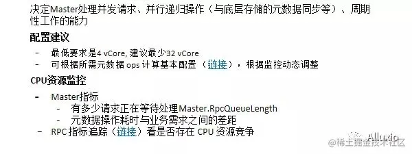 另一方面是Master端的CPU资源,CPU资源决定Master处理并发请求、并行递归操作以及周期性工作的能力。而在海量小文件场景下,Master CPU其实是决定了我们能处理多高并发的海量元数据请求。建议最低要求是4个core,在生产中至少把它打到16或者到32个core,可以根据所需元数据的ops计算基本配置,并且动态调整。