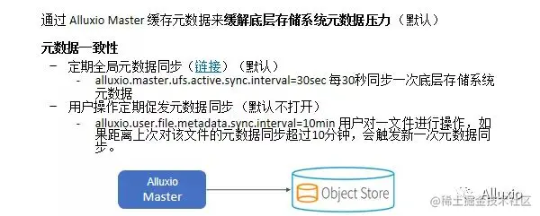 可以通过Alluxio master的元数据缓存来缓解底层存储系统的元数据压力,也就是说我们的应用可以直接来master端要元数据,而不需要一次又一次的去存储系统拿数据。很多公司找到Alluxio,也是因为他们的底层存储系统的元数据压力非常的大,HDFS cluster,ceph集群完全不能处理这么高的元数据请求,而使用master可以缓解这部分的压力。但是这会涉及到一个问题, Alluxio的元数据跟底层存储系统之间的元数据是否是一致的。为了保证元数据的一致性,一种方式是定期的全局元数据同步,这个是默认的配置。比如说每30秒会完全全局同步一次底层存储系统的元数据操作,而另一方面可以用用户操作来定期促发元数据同步,在每一个用户对一个文件进行操作之前,我们先看一下对这个文件的上一次元数据同步是什么时候发生的,如果超过了一个指定的数值,就再来一次元数据同步。