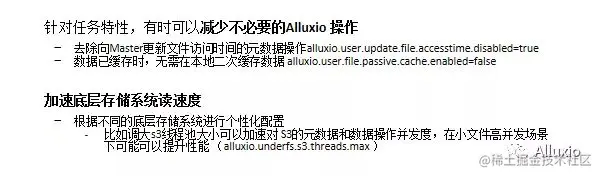 有的时候可以针对用户特性,有时候可以减少不必要的Alluxio操作,比如说可以去除向master更新文件访问时间的元数据操作,可以表示这部分元数据不需要经常去更新这个文件最新访问时间是什么时候,这部分分析并没有用,那就不需要去更新这部分信息,可以大大减少RPC的操作。而有的时候数据如果已经缓存在一个本地集群中,而本地集群的读取性能已经足够好的情况下,我们不需要再去促发一个本地的二次缓存,因为可能二次缓存也提升不了特别多的速度。同时可以加速对底层存储系统的读速度,可能要根据不同的存储系统进行个性化配置,比如要从s3中读大量的数据或者元数据,那我们可以调大s3的线程池的大小,从而提升对s3的元数据和数据操作的并发度,以提升在海量小文件场景下的性能。