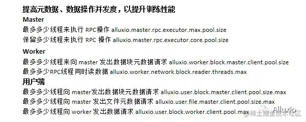 讲到其他的一些优化,包括可以去调高线程池的大小,线程池的大小决定了很多元数据,数据操作的并发度,也就会决定训练性能。可能I/O的元数据的延时,包括数据的并发,数据的吞吐这样的等等的数据性能,会影响训练性能。通过调高线程池的大小也许能用更多的线程来并发地执行这些操作以提高性能。这些线程池包括master、worker以及用户端的不同的线程池,这些线程池决定有多少个线程来执行操作,以及最多保留多少的线程来执行操作。
