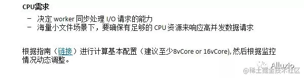 而worker的CPU也决定worker同步处理I/O请求的能力。在海量小文件场景下,我们要确保有足够的CPU资源来响应高并发数据请求,特别是每读写一个文件,可能都会发一个RPC请求, RPC请求是需要有足够的CPU资源在背后予以支撑的,可以跟着指南计算基本的配置,至少8-16 vCore,然后根据监控再动态调整。