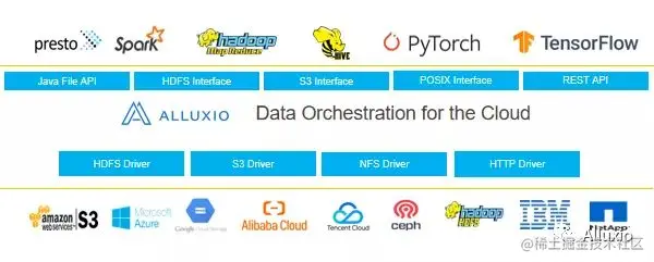 相信很多人都非常熟悉, Alluxio是可以对各种不同的数据源,包括阿里云、腾讯云的数据进行缓存,以提升各种训练的性能,它上面包括了像PyTorch, Tensorflow等一系列训练的软件。