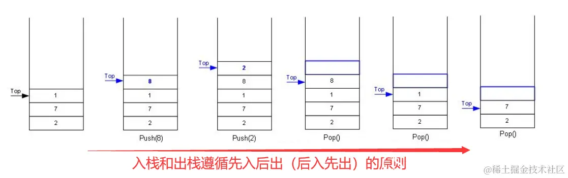 出栈:栈的删除操作叫做出栈, 出数据也在栈顶
